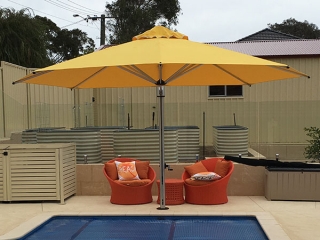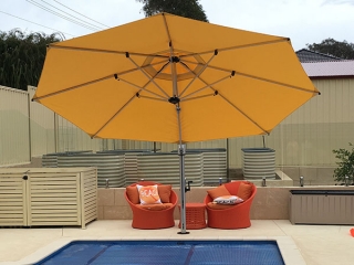 Poolsider Cantilevered Umbrella – North Beach Our luxurious Poolsider Umbrella with a bright yellow canopy RetractableWind rated