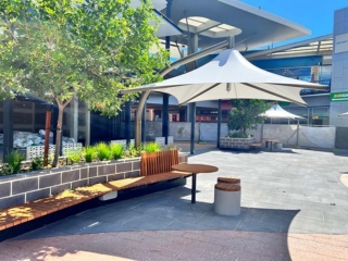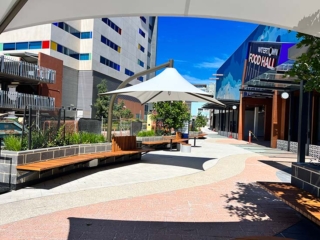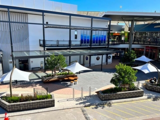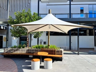 Watertown Shopping Centre – West Perth Ionic Commercial Architectural Umbrellas custom engineered to incorporate bespoke curved cantilever posts for the Watertown Shopping Centre Food Hall outdoor area in West Perth. BrandableCommercialIntegrated lighting availableRetractableWaterproofWind rated